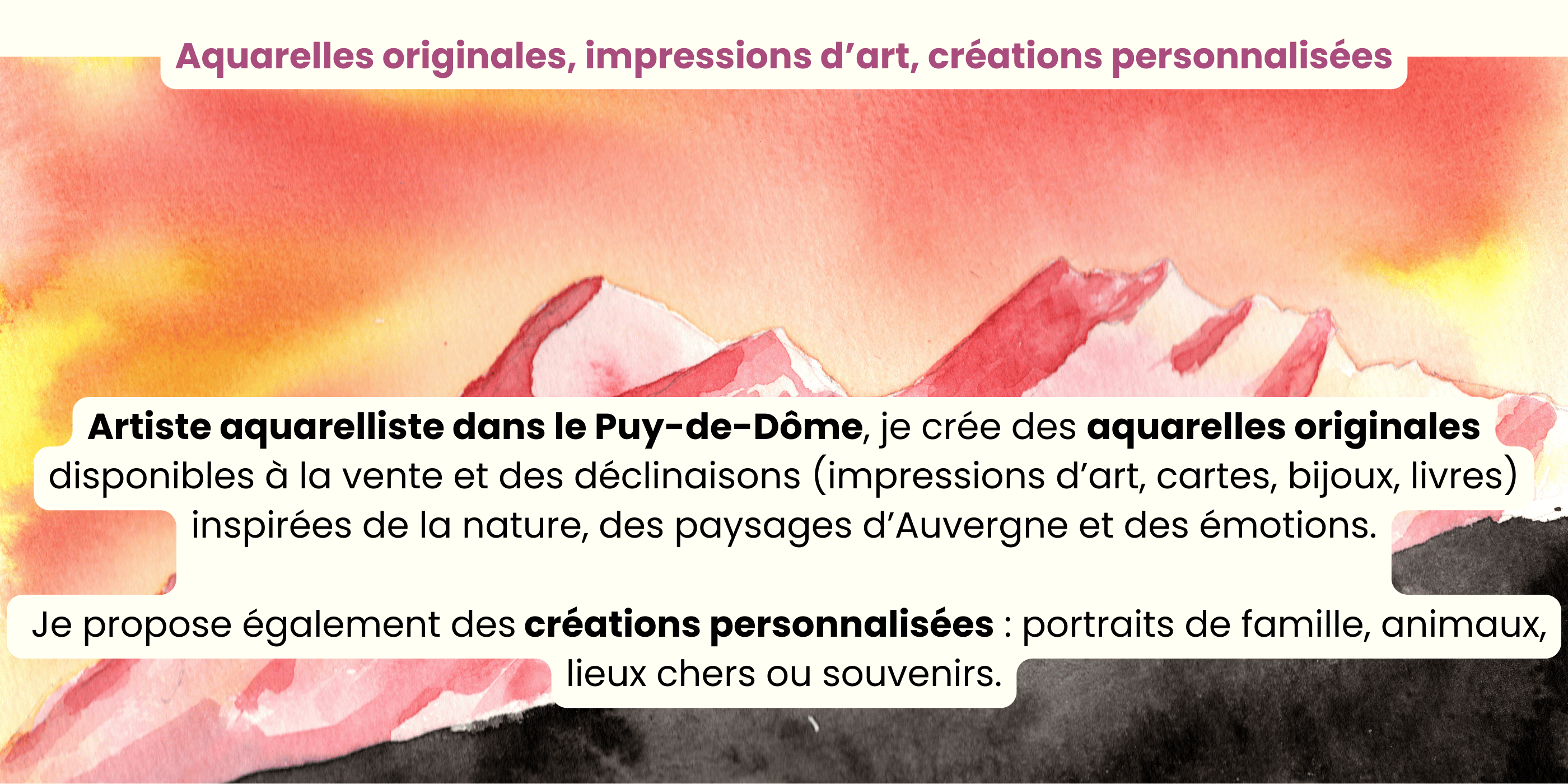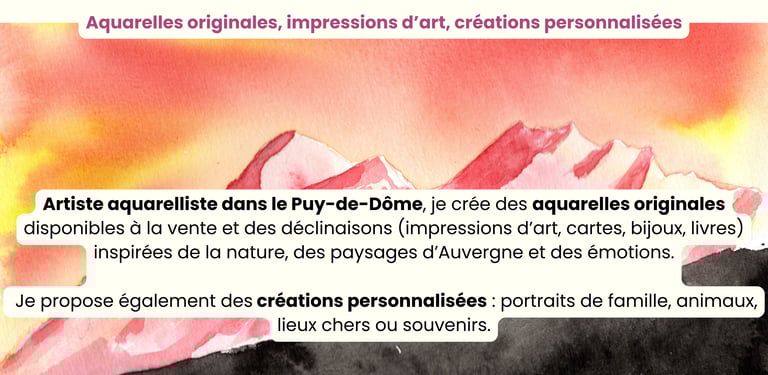 Peintures originales, reproductions et livres inspirés de la nature et des paysages.Artiste aquarelliste dans le Puy-de-Dôme, je crée des aquarelles originales inspirées de la nature, des paysages d’Auvergne et des émotions.
